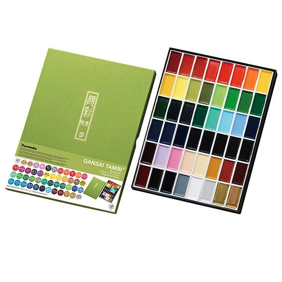 The Kuretake-Gansai Tambi Watercolour sets are filled with traditional Japanese watercolours for professional artists and crafters alike. These extra large pans are ideal for sketching, illustration, sumi-e, manga, calligraphy and more. The range includes a good selection of vivid colours with creamy consistencies.