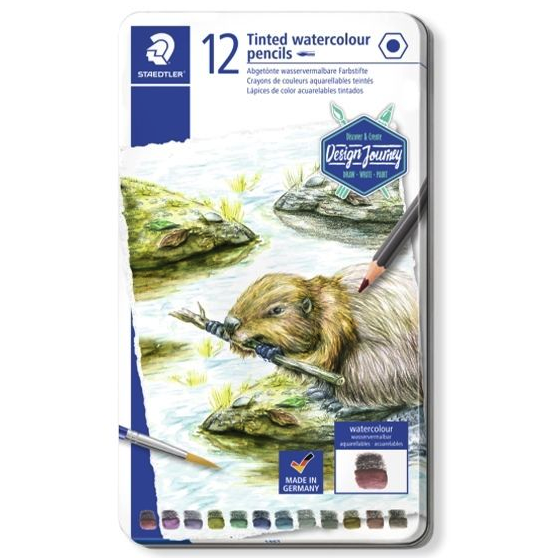 Tin of 12 tinted watercolour pencils with a hint of graphite, giving two completely different effects with the one pencil, whether used wet or dry.