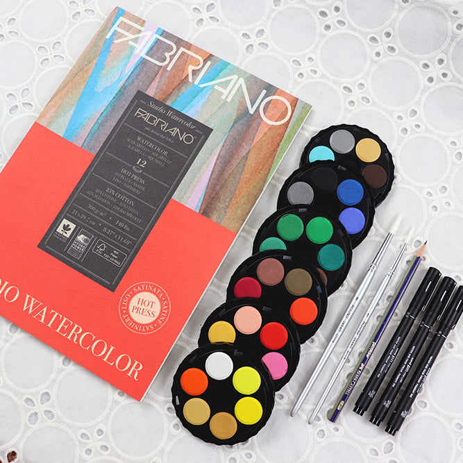 When it comes to watercolours, you get what you pay for. Cheap paints = cheap watery outcome. Mrs Red put two different watercolour disc paints to the test in Compare the Pear (blog post to come) and the Koh-I-Noor stood out plus it has a metallic disc to add a little sparkle to your paintings. The brushes are watercolour brushes, holding a lot of water and very soft and do not fray. The pens are waterproof ink and will not fade on you. And the paper is a student grade perfect for Wine & Untangle art classes.